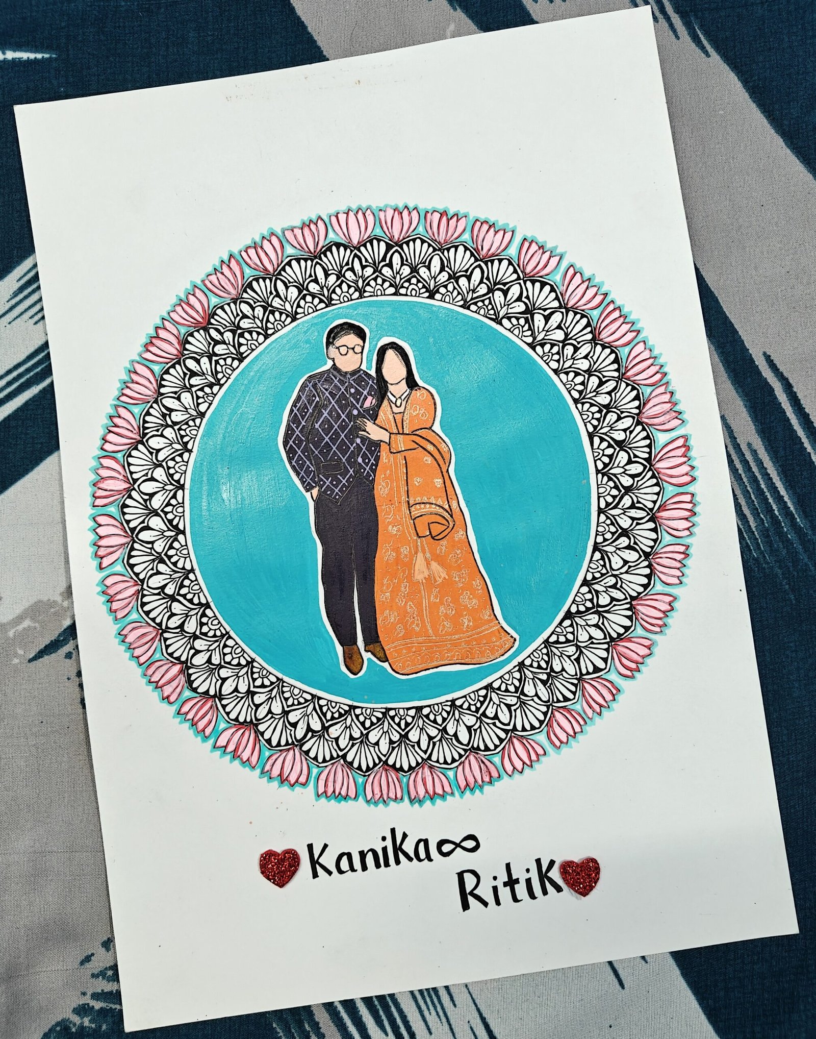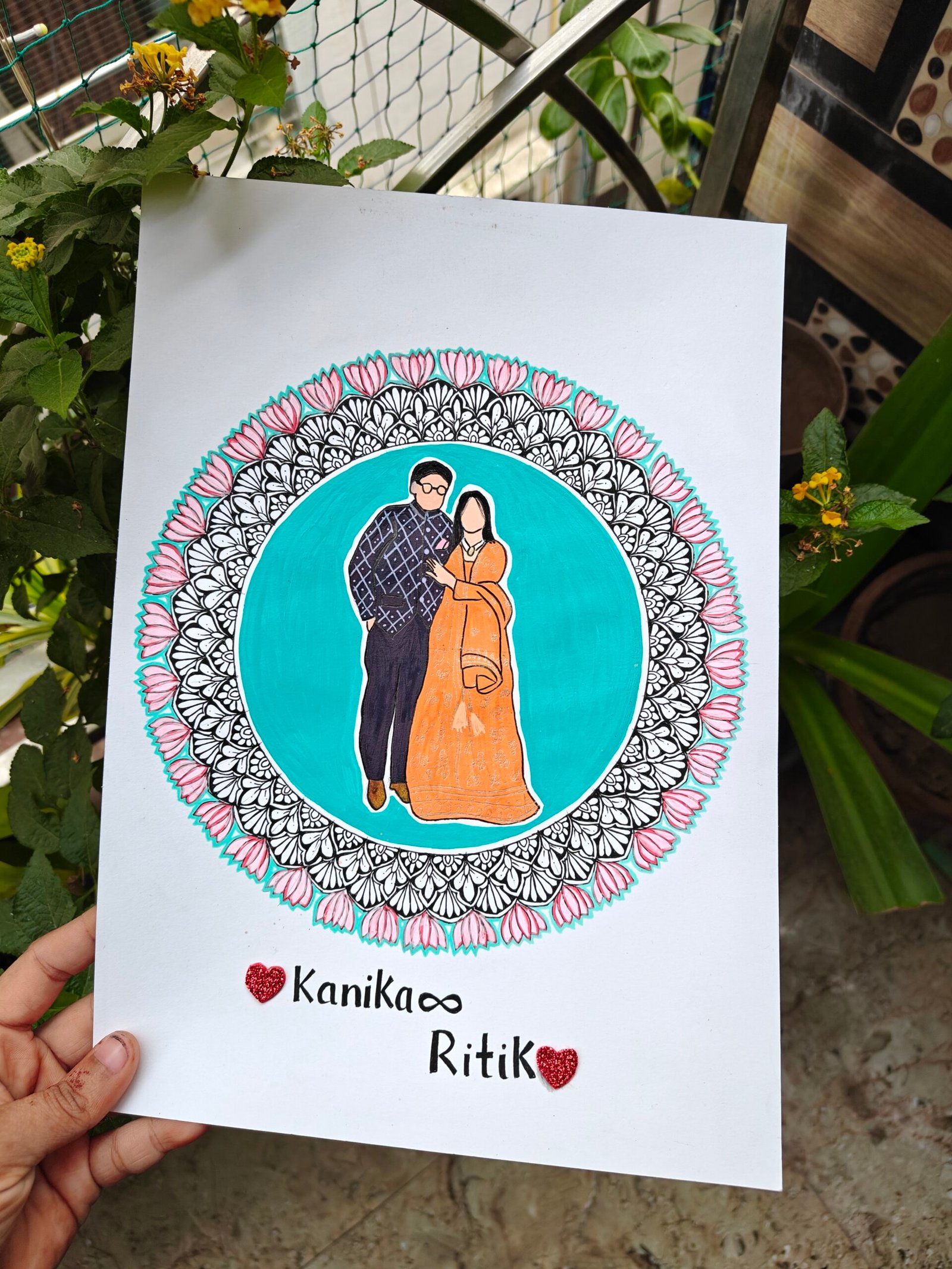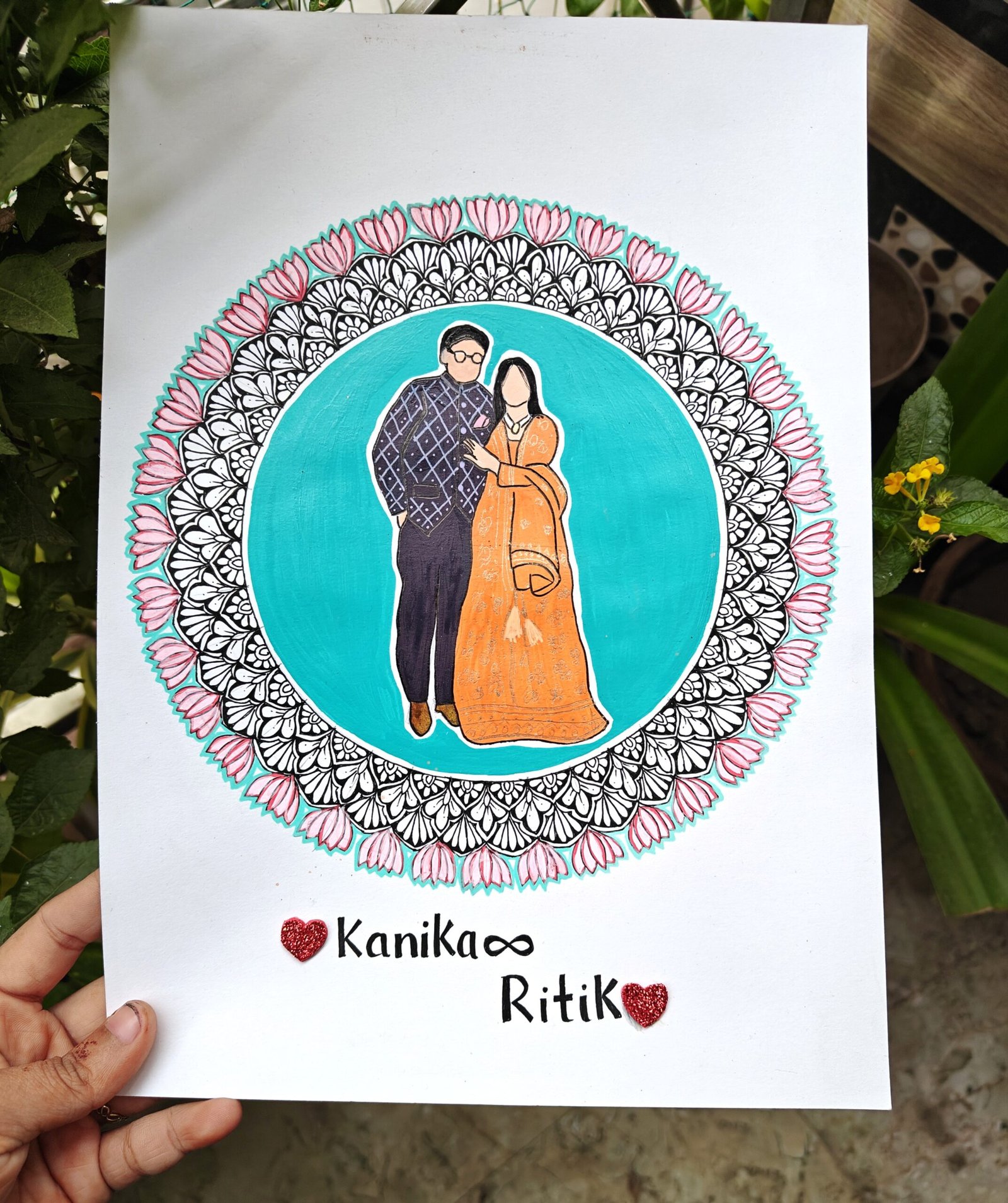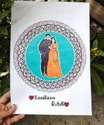 Handmade Custom Couple Mandala Portrait featuring a personalized couple illustration inside an intricate lotus mandala. Perfect anniversary, wedding, or gift artwork. Fully customizable with names, colors & details.