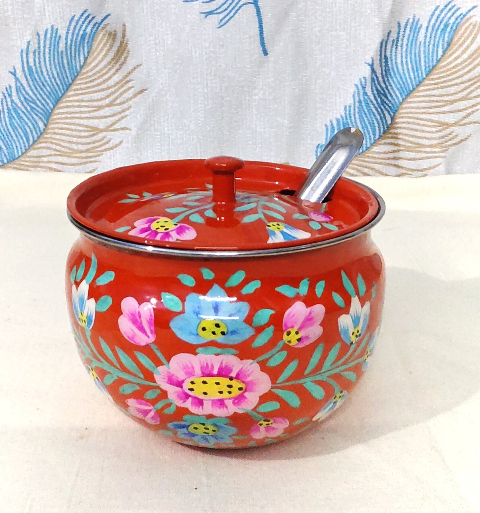 Crafted with durable metal and finished with a glossy enamel coat, it comes with a matching lid and a stainless steel spoon for easy serving. Ideal for storing sugar, salt, mouth freshener, dry chutney, or spices, this piece also works beautifully as a decorative kitchen accessory.