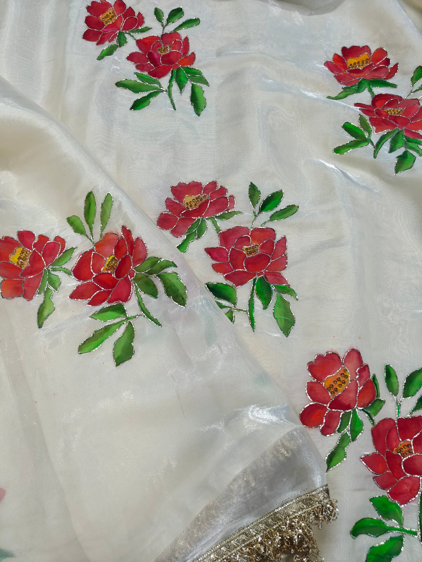 Add a touch of elegance to your wardrobe with this beautifully Pure Organza Tri- Flower Dupatta, Each piece is uniquely hand